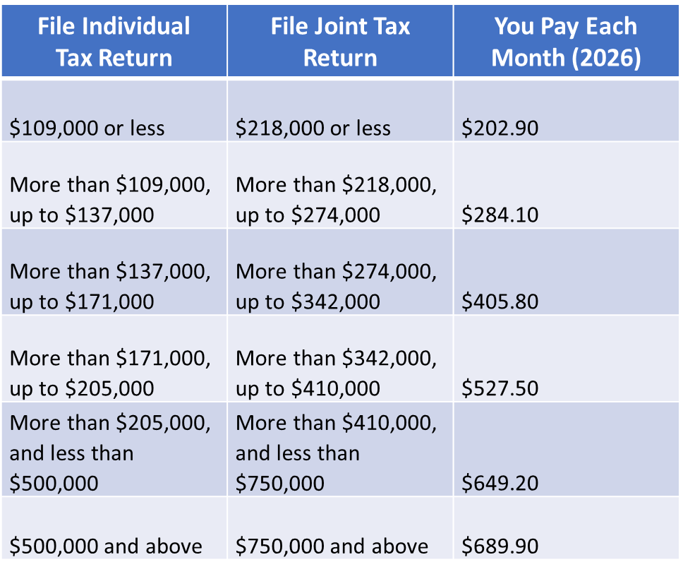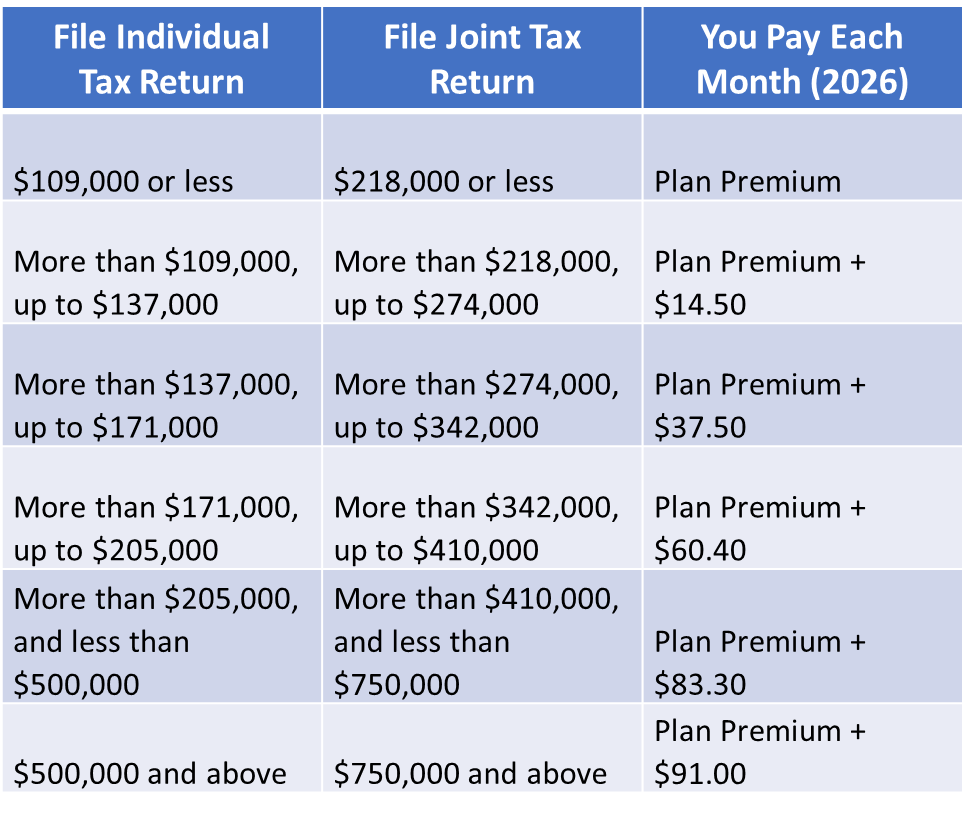 There is a two-year lookback for IRMAA. For example, if your income as reported on your tax return from 2024 fell into the high-income category, you would pay IRMAA for 2026 Medicare monthly premiums.